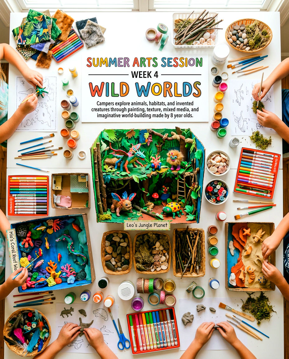 Campers explore animals, habitats, and invented creatures through painting, texture, mixed media